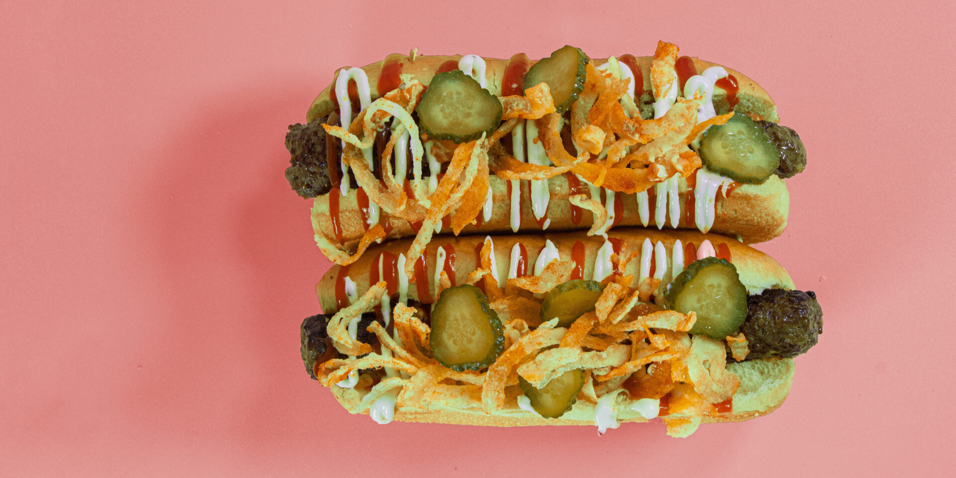 Burger Dog ins Brötchen legen. Mit Burger Liebe Ketchup und Beste Mayo im Zickzack garnieren. Gurkenscheiben dazu, großzügig mit Röstzwiebeln toppen.