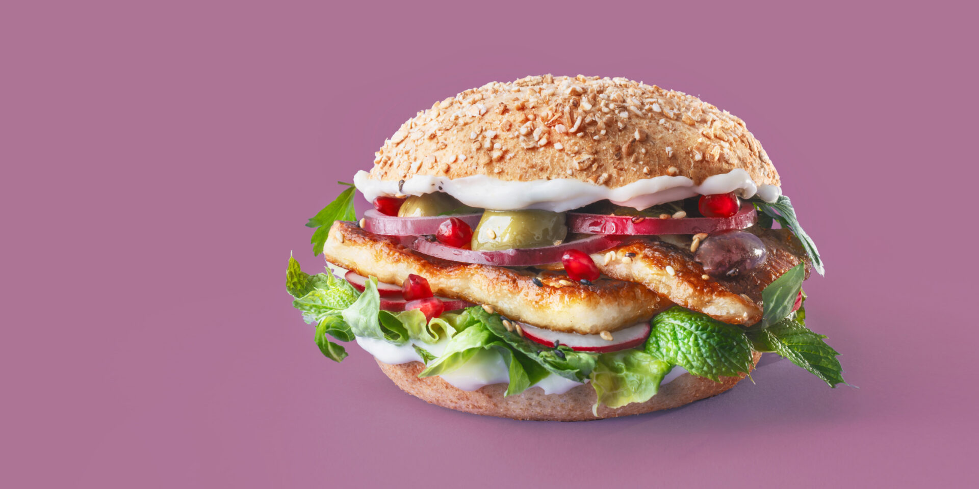 Untere Hälfte großzügig mit Burger Liebe Aioli bestreichen. Mit Romanasalat, frischer Petersilie, Minze und Radieschen belegen. Gebratene Halloumi-Scheiben darauflegen, dann rote Zwiebelringe, Olivenhälften und Granatapfelkerne als Topping. Obere Brötchenhälfte ebenfalls mit Burger Liebe Aioli bestreichen und den Burger schließen.
